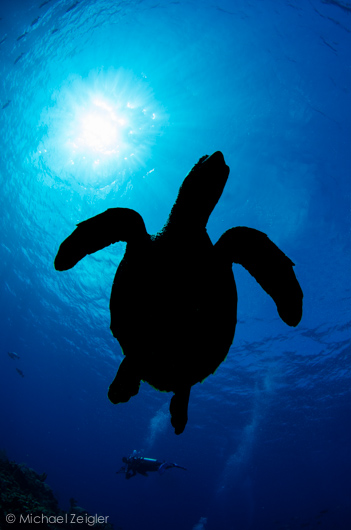 This is the same turtle, cruising overhead before swimming off into the distance. As soon as I noticed it was "taking flight," I quickly turned off my strobes to capture this silhouette. F16, 1/320, ISO 200.