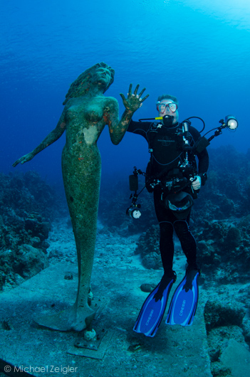 My dive buddy, Steve, posing with the iconic mermaid at the Sunset House reef.