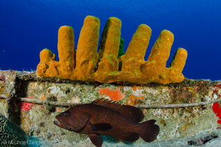 A graysby poses for a portrait below an almost perfectly symmetrical formation of yellow sponges on the wreck of the Nicholson.