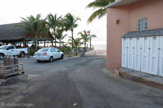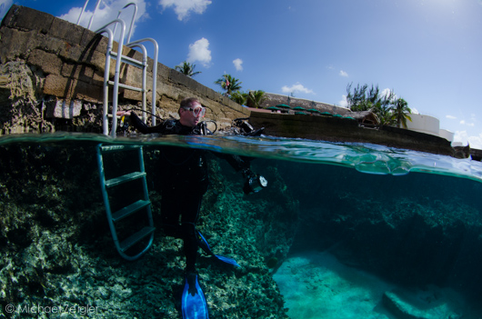 My dive buddy gets ready to exit the warm Caribbean water. My Bar is perched above, serving up awesome mud slides as a great post-dive drink.