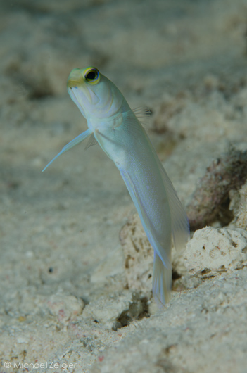 Yellowhead jawfish can be seen near gravel patches in the sand. If you're lucky, you can spot one carrying eggs in its mouth. 105mm macro lens, F16, 1/250, ISO 100.