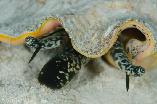 Several conch snails were seen cruising along the sand between the mermaid and the wreck of the Nicholson. 105mm macro, F9, 1/250, ISO 100.