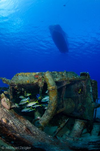 A school of yellow goatfish take shelter in the scattered wreckage of the Oro Verde. The Sunset Diver's boat awaits our return, 60' above the sea floor.