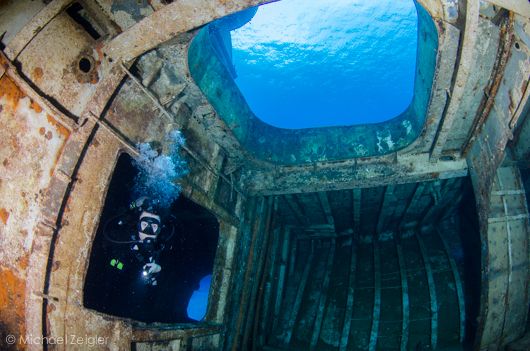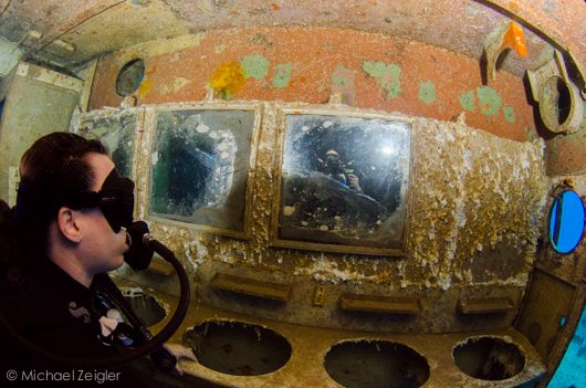 We explored various rooms on the way back to the bow, partly in an effort to avoid the current. Large cut-outs throughout the ship made exploring easy, and we were often greeted in each room by schools of tiny fish.