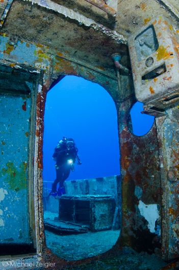 The diving the ex-USS Kittiwake was amazing. In her prime she was a submarine rescue vessel, and was sunk in her final resting place off the coast of Grand Cayman on January 5, 2011. Sitting in just 60 fsw and with her tower only 15 fsw from the surface, this great wreck dive is accessible to scuba divers and snorkelers alike. After descending near a swirling school of horse-eye jacks, we made our way into the bridge, and then back into the head.
