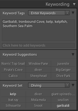 An example of a key-worded image. I have a Keyword Set for "Diving," which helps speed up the process of commonly photographed subjects. Based on your image, Lightroom 4 will also display suggestions, which is nice. Thanks, Adobe!