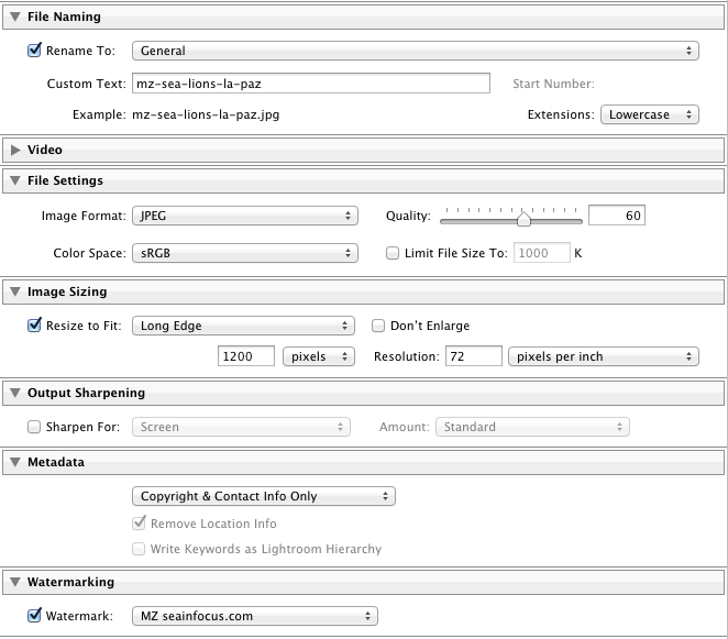 This is the export window in Lightroom 4. This figure shows my preset when exporting images to be shared on the web. Be sure to always include your copyright information!
