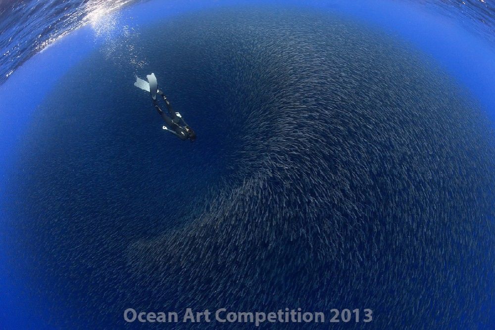 The story: ” I got this picture last may, in Tenerife, Canary Islands. It was in the afternoon, I was with a group of friends and my girlfriend taking pictures of pilot whales. We saw in the distance, there was forming a big group of shearwaters and seagulls,countless in numbers. Underwater there were many spotted dolphins. The baitball would spin and spin but not move apart, all the time changing its shape. Dolphins, shearwaters, and seagulls attacked the group of fish, and it changed shape . When the scene was quiet, my friends and myself tried to get pictures and video of the movement. My girlfriend is an excellent swimmer and freediver and I told her to dive near the ball. It wasmy chance to get thispicture.