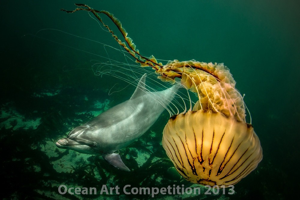 I captured this shot during my daily free diving on the West Coast of Ireland. It was in summertime, and plankton was booming together with jellyfish. Just at the time when I admired this majestic large Compass Jellyfish a curious Bottlenose dolphin was passing by and say hello, and I pressed the trigger to get both animals beautifully composed together.