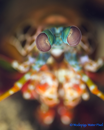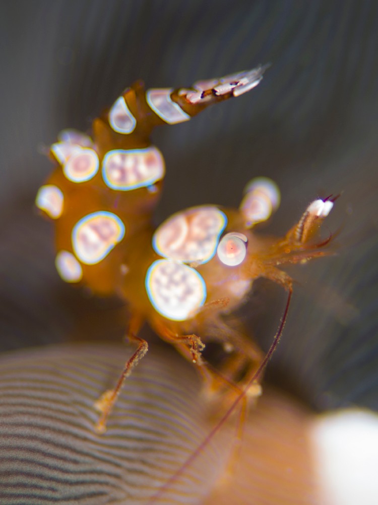 These essential cleaner shrimps, mainly found in crevices on the reef or beneath human rubbish like tires, serve up something interesting and versatile for shallow DOF photography. Banded Coral Shrimp eyes are situated more or less in the center of the creature lengthwise. This means that we can create depth, not just in the background with the shrimp’s body, but also have a strong foreground with its claws out in front.