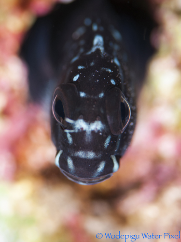 This particular species, commonly found in little nooks and crannies in the reef, is by far the least camera shy of the Blennies. It may scurry back down its little refuge if approached too aggressively, but more often than not they come back out to stare right at the lens port as if hypnotized by their own reflection. I have seen lens ports come very close to the Yellow Tail Blenny without them flinching, so shorter focal length lenses like a 60mm can be deployed quite easily.