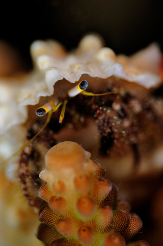 An effective method for shooting shallow DOF with a hermit crab is to first watch the crab and compose your background. Think of where the eyes should be in the image and slowly observe the crab's eye movements to determine where they usually stop. Next, place the focus point at that spot, making adjustments to framing as necessary. Then it’s just a matter of patience and seizing the chance to take the shot when everything is lined up. This may take some time to achieve and a bit of luck is needed, but well worth the effort. Hermit crabs' mainly sedentary nature means a 60mm lens may suffice, although a longer focal length could be just the thing to accord them enough personal space to really come out of their shells.