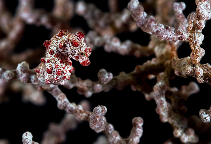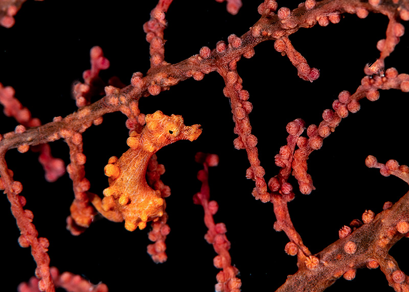Of the seven species, the two that are widely distributed and most commonly encountered by divers over their broad range are: Hippocampus bargibanti and Hippocampus denise (commonly known as Bargibanti’s and Denise’s pygmy seahorse respectively). These two species have evolved a special association with sessile coral reef invertebrates and are only found living on gorgonian corals. While Denise’s pygmy seahorse is known to live on at least nine genera of gorgonians, Bargibanti’s pygmy seahorse is found on a single genus of gorgonian coral, Muricella.