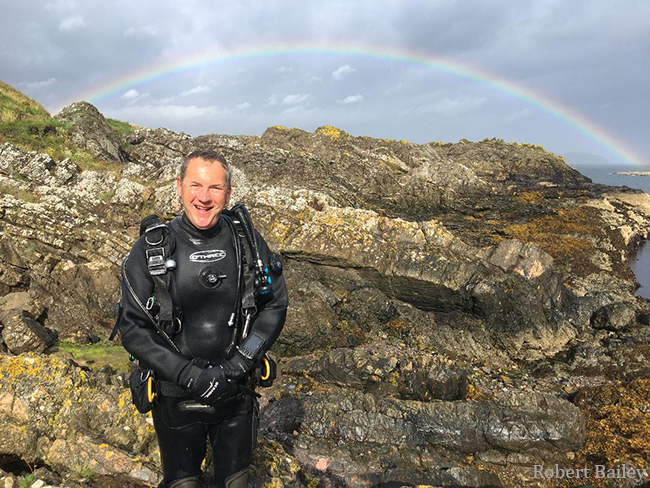 We fit in a quick dive in Eyemouth at Greenend’s Gully the next morning. I opted to be shore cover and ushered Charles in and out. Scattered showers in the area gave way to sun, and we enjoyed an amazing rainbow over St.Abbs head when Charles resurfaced. I considered this a good omen.