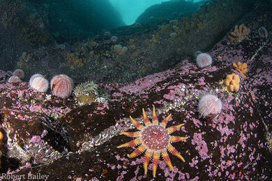 Dive two found us at Noss Head. It is a dramatic cliff face, scarred with deep clefts, and home to the largest colony of gannets in the UK – who on occasion are said to buzz divers on the surface when SMBs are up.  Following the cliff face down you end up in a field of large boulders, with healthy numbers of juvenile cod hugging their outlines. Some boulders are scoured clean in places from eons of swell, while others are festooned with purple encrusting sponge, dotted with dead man’s fingers, sun stars, and dahlia anemones. A couple of grey seals flew by on the dive, but retreated into the privacy of a favourite cave, not to be seen again.  Dramatic views up the gullies were obscured that day by less than perfect visibility owing in part to the swell. A dive worth repeating in calmer conditions.