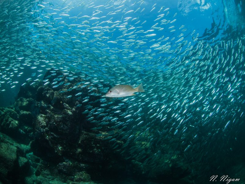 Schools of baitfish can be mesmerizing to watch. Their silver shines with the light as they undulate in formation in the blue water. It can be especially entertaining when sea lions swim through attempting to catch a quick afternoon snack.