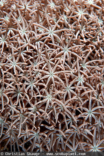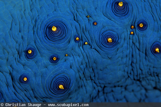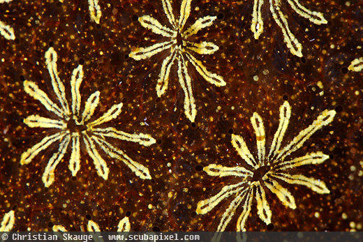 Echinoderms are another rich source of patterns. To me, sea urchins are more interesting dead than alive, because the spines get in the way of their intricate shells. Looking closely at starfish and sea cucumbers is usually much more rewarding: Some species have their entire bodies decorated by beautiful patterns. All you have to do is to find a suitable crop, as these animals will let you shoot on forever without running away.