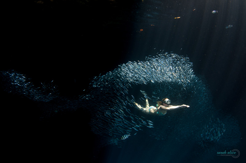 Our first visit was during a busy time and a few boats had entered into the space. With snorkelers everywhere I knew that we would have to come back to shoot at a quieter time, and that the image I wanted to create would need a little setting up. Luckily Cath (who agreed to model for me) and another photographer were able to visit the cave at such a time and I had the opportunity to play with the strobe positioning in correlation to the sun entering the caves entrance and decided how best to direct the subject. With the unpredictability of the bait fishes movements we were required to make dives over a period of approximately forty minutes but we knew we had the shot.