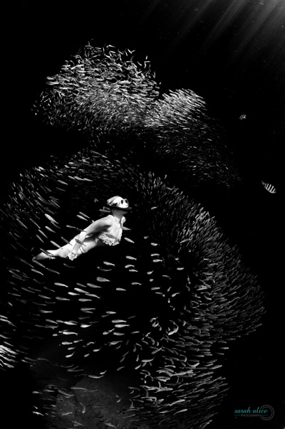 The model first enters the water and swims through the bait fish. Photo: Sarah Alice Lee