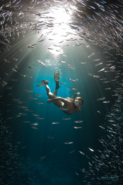 As we dived into the water, a cathedral of cascading light and shadow greeted us and visually played with the realms of reality. Your imagination can be free here and the thought of what was lurking in the darkness intrigued me. That familiar hand of the blue reaching up and willing you to dive down and explore, my camera in hand ready for some action. The cave was barren of life on the walls of rock which, was a contrast to the abundant coral reef that adorned the mouth of the cave entrance. It was, however, brimming with bait fish that to look at was like observing a constantly moving sculpture reflecting flashes of light as the late afternoon sun hit their scales. Bait fish at depth are tricky to expose properly when using underwater strobes because of how reflective they are, but their movement was mesmerizing and when my freediver friend entered the water, diving right into the school, I knew there had to be a shot there.