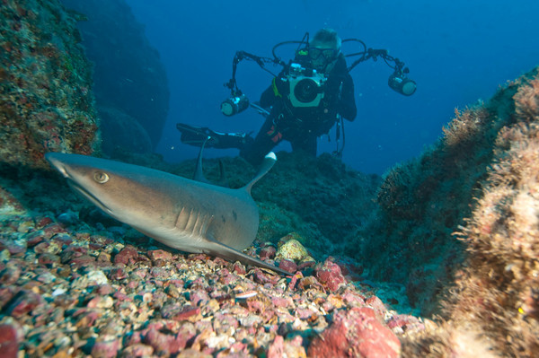 Dozens of white-tip sharks are usually seen on every dive at all depths, cruising around the rocks.
