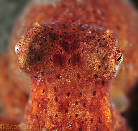 Here the background is nicely blurred, emphasizing the goby. F11, 1/250th, ISO 200. Anilao, Phillipines. Here's an article on "face-on" macro underwater composition.