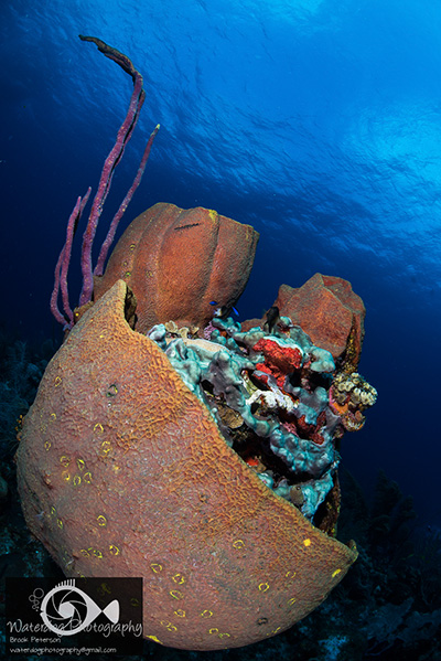 An image that is properly lit will have even lighting throughout the subject, without any highlights that appear white, and without any fall off of light through the middle. The viewer’s eye should not be able to immediately tell whether a strobe was used, or whether the image is naturally lit. When we are under water, everything we see has a blue cast, so we have to use strobes to bring the color back. Our challenge as underwater photographers is to make images that don’t have a blue cast, but that also don’t have an obvious use of strobe. The image below shows a large sponge that is properly lit from top to bottom, with a beautiful blue background. The viewer must look closely to see that the ground around the sponge has a blue cast.