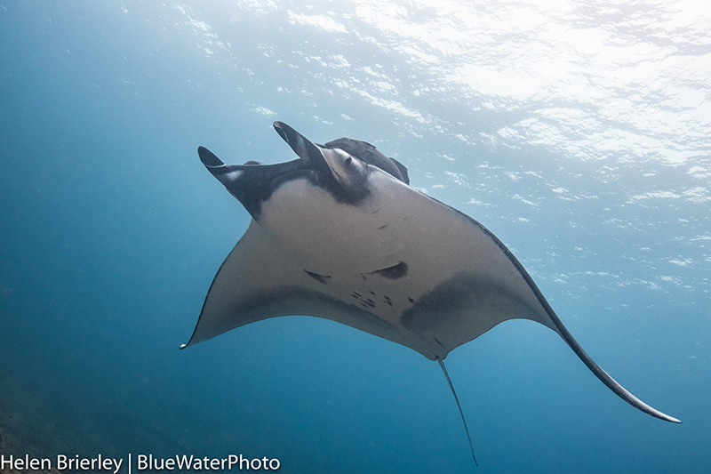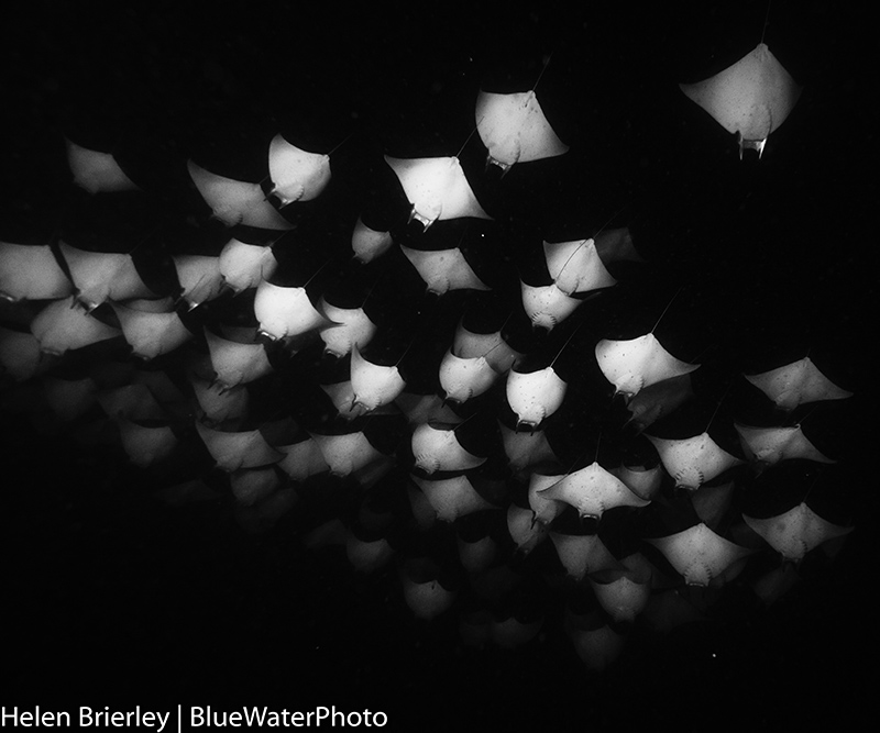 Our second day of diving ended with a spectacular night dive. We watched hundreds of mobula rays feeding on the plankton attracted to bright lights positioned by the crew in nearby shallow waters. Again and again they swooped down over our heads in formation, then up into the lights only to circle back around, fan out across the sand and swerve in unison for another fly by.