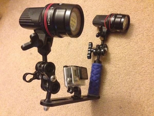 One trick to recording steady GoPro footage is to use a wide GoPro tray and handle setup. I have often dived with the rig below on my BCD to shoot video in between DSLR still photos.