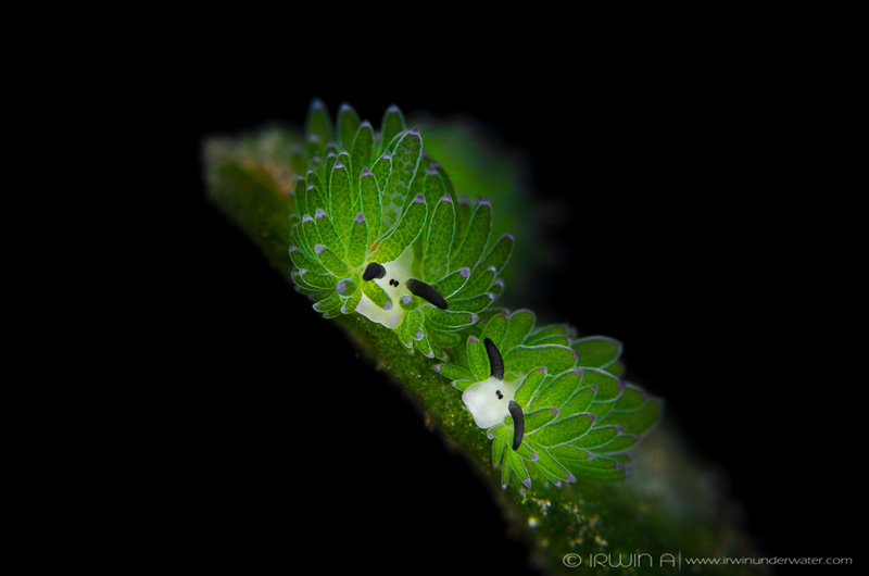 Shaun the Sheep is on almost everyone’s nudibranch photo collection wishlist. I visited during the right season for this nudibranch in Tulamben, and there were many of them living on the green leafs underwater. I was surprised at the size of this Costasiella – it was big! I estimate around 5-8mm, which made it easy to shoot. I composed this scene with two nudibranchs to try something new while still making the nudibranch look cute.