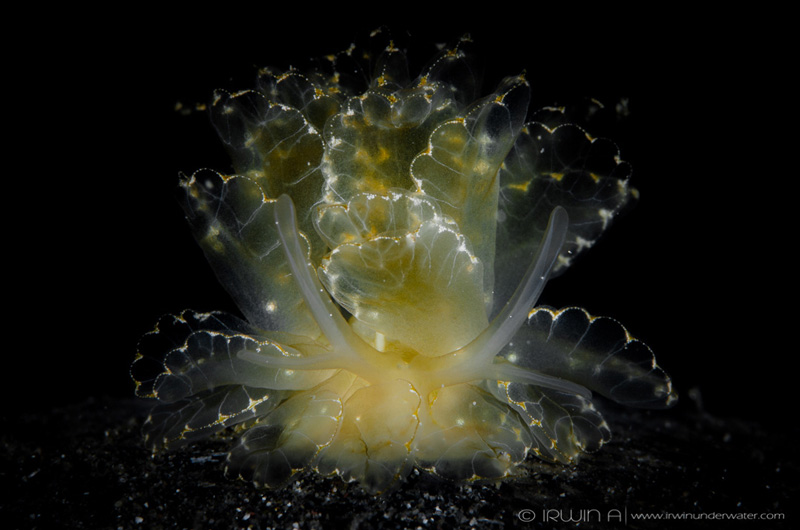 One of the most rare nudibranchs to find, the Cyerce elegans has so far only been seen in the Philippines (Anilao/Romblon). It is very to difficult to shoot as it moves around a lot. I think the best way to shoot this Cyerce elegant to create a stunning image is to create a black background so the transparency of the yellow body will pop and stand out.