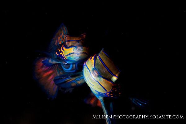 Every evening, an adorably amorous species of dragonet goes off in search of a mate.  Like clockwork, the colorful fish find a special friend, and just as the sun is setting, take part in a spectacular little dance.  At first they greet and start swimming around each other, slowly rising up from the reef.  Once at their apex, they cuddle and spawn gametes into the water.  The mandarinfish at Lighthouse Reef in Malapascua are especially large and abundant.  Attentive photographers can nail the split second of spawn by following directions closely.  First, find a pair and stick with them.  Second, don’t use any light unless it is red.  This makes focusing a challenge, but the little fish can get distracted out of their nightly ritual.  Finally, wait for the fish to start swimming circles and rise up from the reef.  Four seconds later, they spawn and dart back to their hiding spot in the coral.