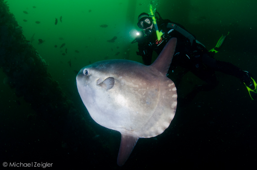 Why: These are about 20 miles from the coast, and sit in several hundred feet of water. Being so far from shore and in such deep waters means that you could be visited by a whole host of pelagic critters. Molas, large jellies and salp chains, massive schools of fish, and even pelagic sting rays have been seen here. Not to mention the playful sea lions to hang out at the platform. Huge Metridium anemones, scallops, and brittle stars cover the structure, providing unique photo opportunities.