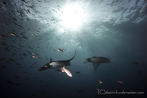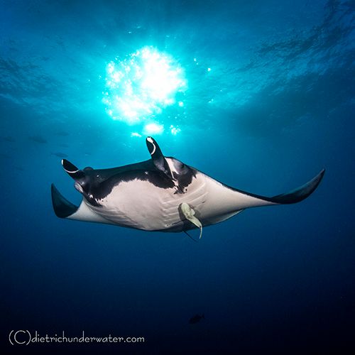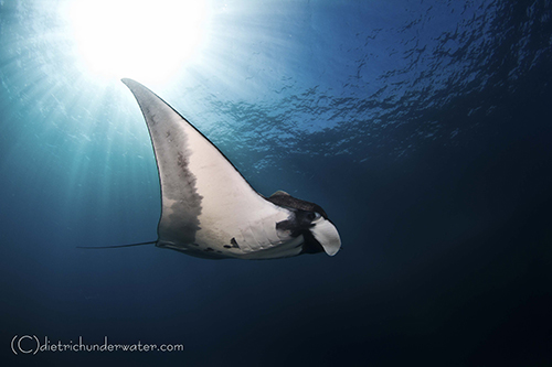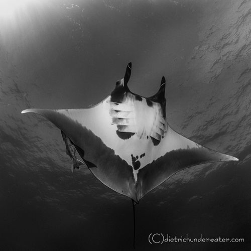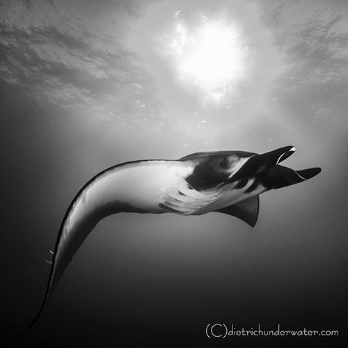 In my opinion, the sun is the most important lighting tool when photographing manta rays. The sun serves as a great backlight and can add drama and mystique to any photo. Due to the size of the mantas I swam with, a two-strobe setup is a must, as one strobe can’t handle the job of lighting such a big subject. The strobes will even out the lighting and fill in the shadows, creating a properly lit image.