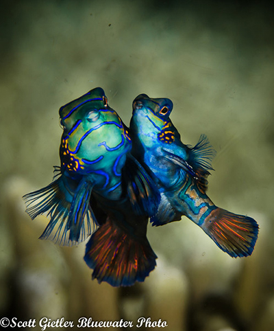 Mating Mandarinfish. Nikon D7000, Nikkor 105mm Lens, Sea & Sea Housing, 2x strobes. Mandarin fish mate only at dusk, for about 1 second and then quickly drop back into the coral.