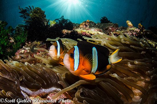 Clownfish and sunburst. Nikon D7000, Tokina 10-17 Lens, Sea & Sea Housing, 2x strobes. They are plenty of different clownfish & anemone species at most of the Anilao dive sites.