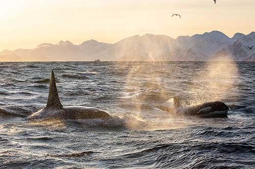 From November to January, orcas can be found hunting the frigid waters of Tromsø, in northern Norway, for spring-spawning herring. Orcas follow the migrating herring into the fjords and, in a perfect scenario, they separate smaller patches of herring from the larger shoals and force them to the surface. November and mid-January are best, as there’s still sunlight in northern Norway. In the last week of November, the Polar Night Season sets in until mid-January, and the days turn to 24 hours of darkness.