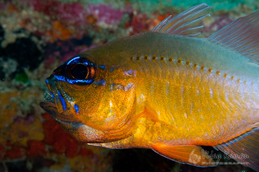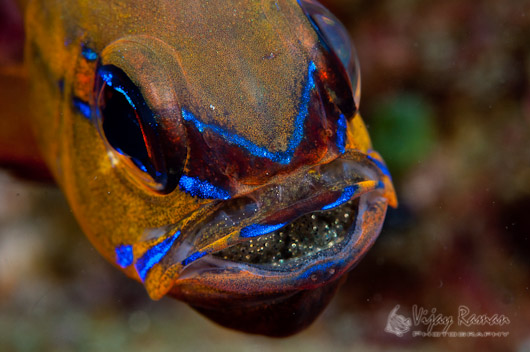 During this time the male Cardinalfish will open it’s mouth to rotate the egg mass on occasion, to keep the eggs clean and aerated. At times it will partially expel the eggs, during this process. It is this behavior, which is interesting to photograph. The egg mass starts out as a white bundle then turns a silvery color with the eyes of the fry becoming evident through the egg casing, towards the end of their development. To capture this behavior, it is best to use a longer macro lens, such as the 100mm or 105mm macro lens, to allow sufficient working distance for the fish to exhibit it’s natural behavior, without spooking it, yet still fill the frame. Every two to three minutes the pregnant male will open its jaw and rotate the egg mass before sucking it back into it’s mouth. You can spot the pregnant male by the extended pouch below its jaw.