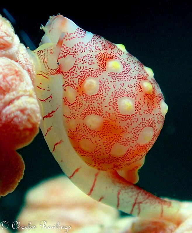However, what had become more and more apparent to me was that my set-up had serious disadvantages when it came to ultra-macro shooting or small subjects in tight places. My portfolio lacked shots of the small mollusks such as ovulids, Simnias, and even certain small nudibranchs. Sure, I could photograph them and then crop them down, but such cropping degraded the sharpness of the images and the pixellation became prohibitive.