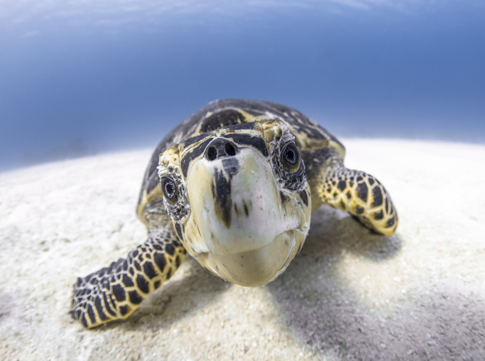 Adequate contrast in one’s photos is another issue when shooting without external lights. Separating your subject from the background is easily accomplished with artificial light. Ambient light photography requires you to place your subject against a contrasting background. My favorite background is a white sandy bottom, followed in close second by the beautiful blue water found at the edge of a drop off. These techniques require a little more work. Getting out in front of your subject is key to an amazing image.