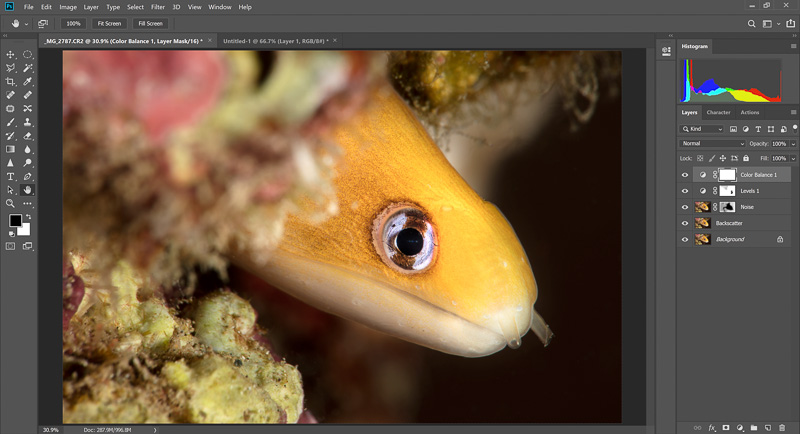 Applying edits in a certain order during post process can help save time and can often make a difference in the quality of your final image. Because adding contrast to your image can bring out backscatter-like effects, it is important to eliminate unwanted particle in the water first. Reducing noise and smoothing out grain prior to adding contrast can also impact how well the other adjustments affect the final outcome.