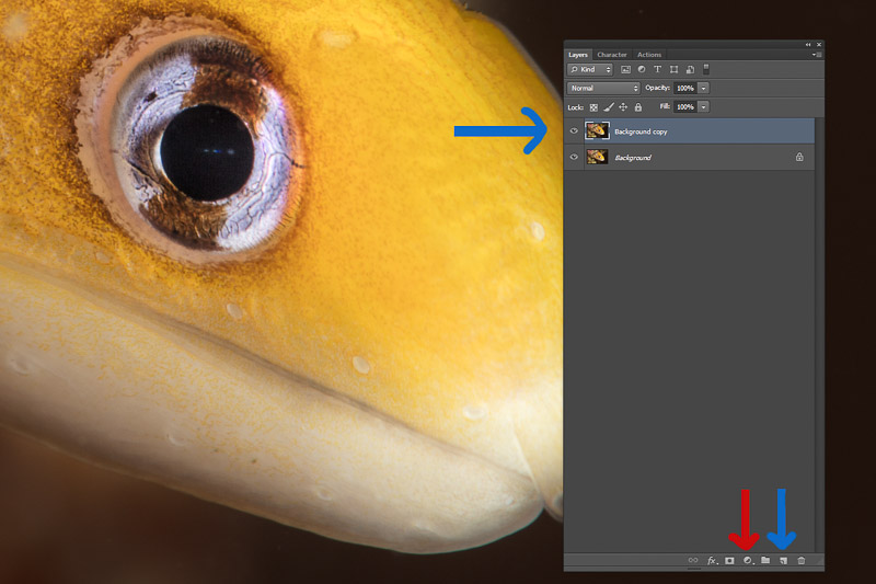 A new duplicate layer must be created for Filters. To manually create a duplicate layer for a filter, either right click on the background layer to find “duplicate layer” or drag the background layer to the square symbol in the layers window before applying a filter. This is pictured below with the blue arrows. I recommended making a new background layer for all filters. It is not necessary but without the layer, blending the filter will be limited.