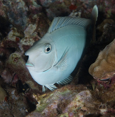 All of the basic rules, get close, shoot up, etc., apply when you are trying to take interesting pictures of fish. The main difficulty is with “get close.” Do not chase fish! They will simply swim away and all you will have to show your friends are images of “fish butt.” Fish tend to be very skittish around divers and a slow, methodical approach tends to work the best. Start taking pictures of your quarry from a distance, gradually decreasing the distance between you and the fish. Once you get close, move very slowly, in a non-threatening manner; make small bubbles (no sudden, large exhales); and take as many images as you can, from different angles. Think about the pictures and compose your shots. Use the rule of thirds, think magazine cover, shoot portrait rather than landscape, use negative space, shoot up, move the strobes around, and take as many pictures as you can in hopes of getting that one, magical “keeper.”