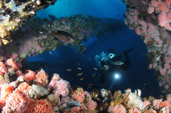 A special type of CFWA photograph is the window shot. Window shots work well when a coral or structure can fill the outside of the frame, creating a “portal” that you shoot through. Shooting at the entrance to a cave, or from inside an encrusted wreck works well. Ideally you will can fish and/or a diver to appear in the portal.