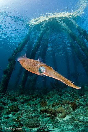 This squid is just inches in front of the dome port. Nice choice of background, and use of vertical lines. Photo by Todd Winner.