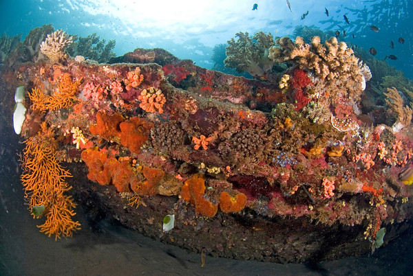 Japanese fishing wreck, Bali. Nikon 10.5mm fisheye lens, F10, 1/125th, ISO 100. This wreck had beautiful colorfil corals all over it, my 10.5mm fisheye lens allowed me to get within 3-4ft of the wreck, I still lost a little a touch of the reds, but I was still close enough to bring out most of the colors.