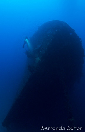 Here we can see the scale of the Nippo Maru wreck in Truk Lagoon. F6, 1/25th, ISO 500, nikon 12-24. Photo by Amanda Cotton. “The Nippo Maru is a fairly large wreck. Getting the entire bow of the wreck and still being able to show detail of the diver was a challenge. Having a very wide angle lens for this shot made it possible.”