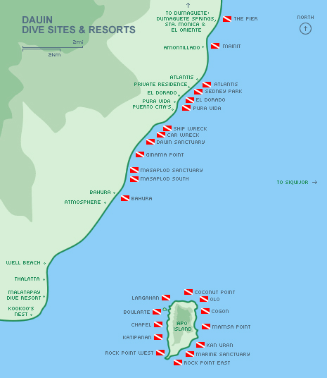 We stayed at the Atmosphere Resort which is a bit south of Dauin on the map. There are two main areas of diving in Dumaguete, off the beaches between Dumaguete and Latasan and off of Apo Island. The main dive sites are shown in the map below.