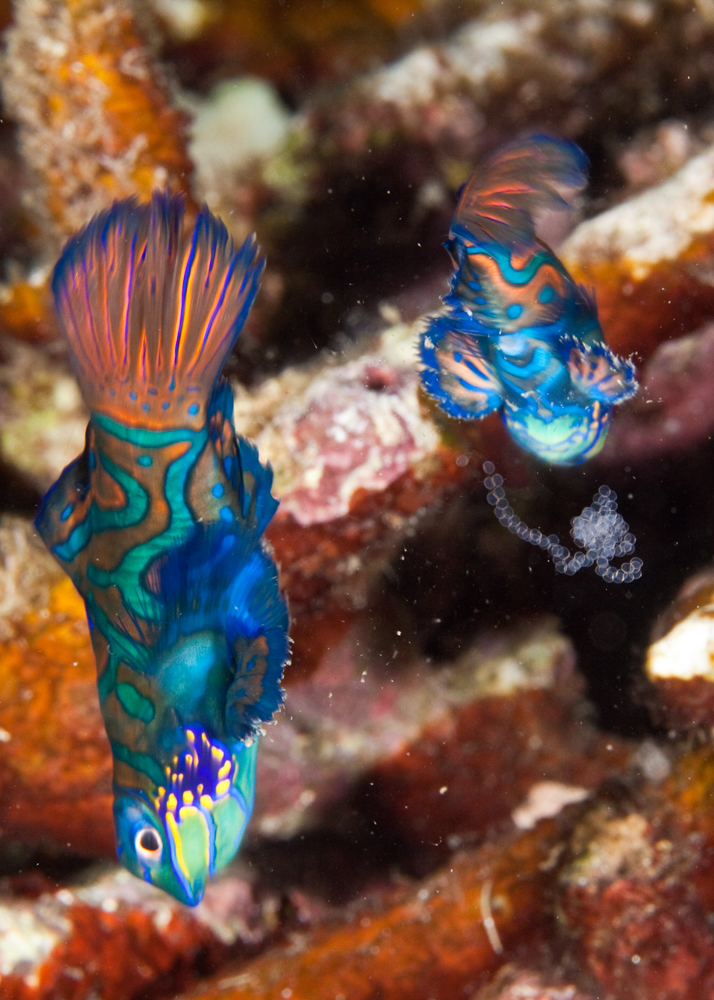 In spite of that, there was excellent macro life in abundance along the coastline. The house reef at Atmosphere resort had a Mandarin Fish reef and at dawn and dusk you could see them mating. We were lucky enough to capture a pair of mandarins right after mating and you can clearly see the eggs that the female has just ejected.