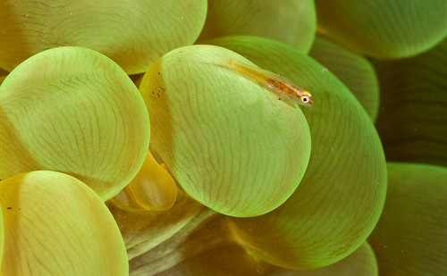 The diving at Apo Island is quite distinct from that of the main island dive sites. We dove Chapel Point, Cogon and The Sanctuary. Gorgeous steep walls with extremely healthy hard coral, large moray eels, clownfish and shrimp gobies were in the sand. We also saw some blue ribbon eels, some Nembrothas and a tiny sea snake. At Cogon, we found a huge school of Jacks that let us enter the school for a very cool experience. Lots of Anthias, as well as juvenile damsel fish. The visibility at Apo was very nice, more than 30 meters in most spots and it is the place in Dumaguete to go to see big schools of fish, really healthy hard coral walls and a few critters. If you are a wide angle shooter, this is the place in Dumaguete for you. Below is a picture of a false clownfish family from Apo Island.